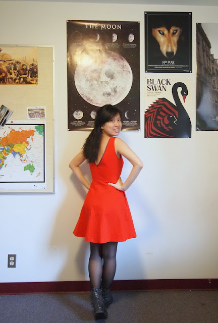 I haven't done an outfit post in a few days, and I feel obliged to do one! Anyhow, I wore my bright red dress to class today in the spirit of Spring!!! Unfortunately, I realized that Spring has yet to arrive on my way to school. I ended up blinding everybody with my dress, and I can't tell if that's a good or bad thing actually. On another note, I wish I could bake, but for now I guess I'll have to live with Walmart's $2 for 10 mini banana muffins!